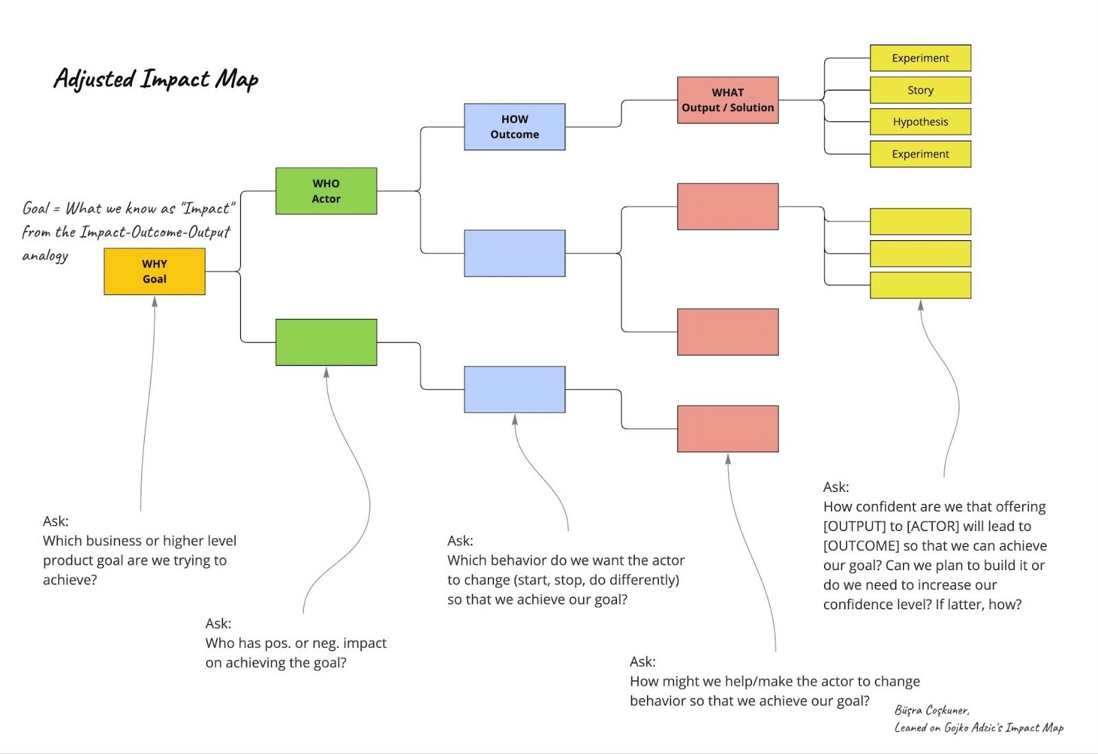 In my workshops, I use an adapted version of Impact Mapping that uses words that we know better in our product management bubble. And I tweak the structure to connect each step with the company’s real strategic goals, address their actual challenges and incorporate their individual ways of working, so every action serves a clear purpose.