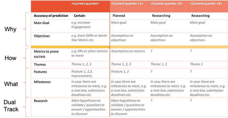 Depending on the clarity of the full year's company strategy, you might have ideas for further quarters but they're rather assumption or even only hypotheses from today's point of view. Only the current quarter is the one that you can say for certain what you're planning to work on. But be careful: Even in the current quarter you might want to decide against a planned feature or improvement as a reaction to market response. Therefore, this overview does not replace good and frequent communication with your stakeholders. It's rather a supporting tool for your conversations. Therefore, I add a remark on the document - where ever I share it - that all of that, even the current "Certain" quarter is not guaranteed and that I will communicate changes with the stakeholders concerned.