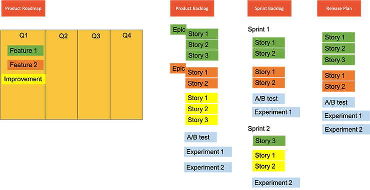 The Product Backlog will be filled with stories for the items on the Product Roadmap. Here's a simplification. And yeah, instead of quarters, you can really take any time horizon. Now, next, later works here, too. The emphasis is on the near term items.