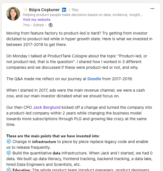 We met to have this conversation after my LinkedIn post created curiosity in the product field, and showed the need for real "behind the scenes" stories (the image links to the post):